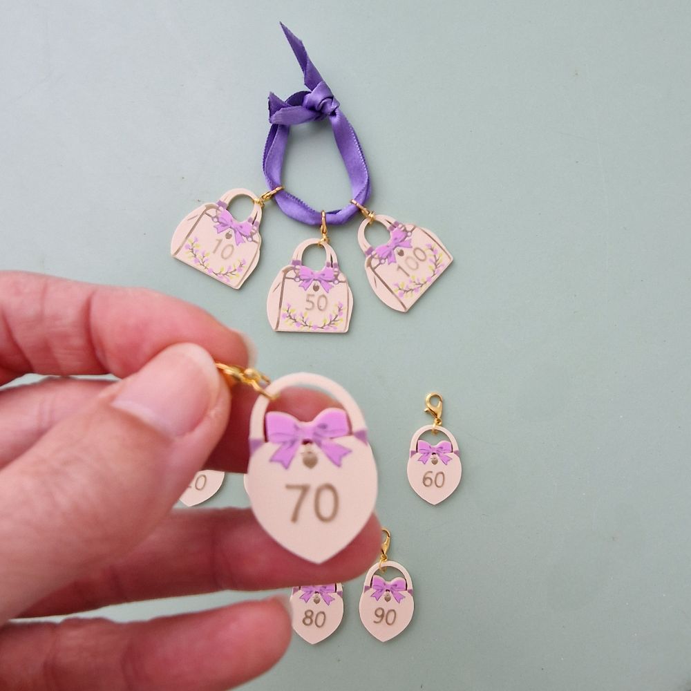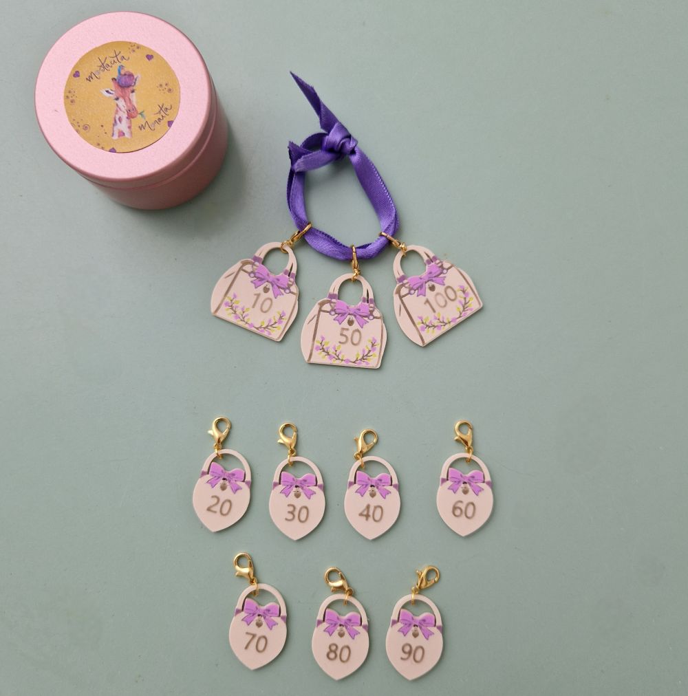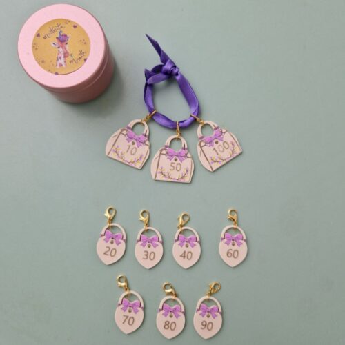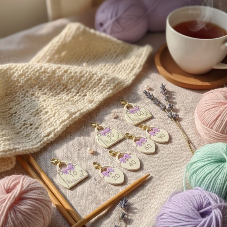 Este set de contadores de filas nace para acompañarte en esos proyectos que requieren paciencia, constancia y amor: chales, mantas, jerséis o cualquier labor que crece despacito entre tus manos.