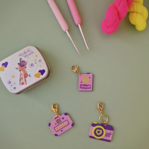 Este set de marcadores es de esas cosas que alegran cualquier labor. Con forma de cámara de fotos, maleta y pasaporte knitter, están pensados para darte ese toque cuqui y viajero mientras tejes, estés donde estés.